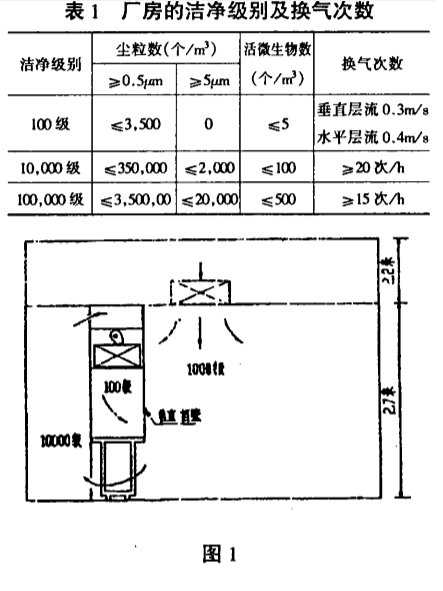 本文介紹兩例醫(yī)藥潔凈工程項(xiàng)目中凈化空調(diào)設(shè)計(jì)所確定的技術(shù)原則,以及按凈化級(jí)別選擇空氣過(guò)濾器,確定換氣次數(shù)和正壓的做法,還介紹了在有粉塵、廢氣和廢熱的車間的通風(fēng)方式,強(qiáng)調(diào)設(shè)計(jì)要搞專業(yè)協(xié)調(diào)配合的重要性。 1.引言 按照衛(wèi)生部最新修訂頒布的《藥品生產(chǎn)質(zhì)量管理規(guī)范》(簡(jiǎn)稱GMP)規(guī)定,各種類型制藥車間要根據(jù)藥品生產(chǎn)工藝、藥品劑型、生產(chǎn)班次等設(shè)置凈化級(jí)別迥異和溫濕度不同(潔凈度100級(jí)一100000級(jí);溫度:20—22±2度,相對(duì)濕度45%-65%)的空氣調(diào)節(jié)系統(tǒng)和必要的通風(fēng)除塵裝置,以滿足藥品生產(chǎn)對(duì)室內(nèi)環(huán)境的要求。 本文通過(guò)醫(yī)藥潔凈工程的實(shí)施,談一談醫(yī)藥潔凈室設(shè)計(jì)體會(huì)。 2.配合工藝及土建,搞好空調(diào)通風(fēng)設(shè)計(jì) 沈陽(yáng)某制藥廠建有四層大輸液水針車間,共計(jì)6000m2一層設(shè)有集中庫(kù)房,二層設(shè)容量250ml、500ml大輸液生產(chǎn)線各一條,三層設(shè)水針車間及臨時(shí)中轉(zhuǎn)庫(kù)房,四層為新產(chǎn)品研制生產(chǎn)車間。由于藥品劑型各異,其生產(chǎn)流程、班次及時(shí)間亦不相同,在空調(diào)方案設(shè)計(jì)中采取了“集中供冷,分散空調(diào)凈化”的布置原則,將制冷機(jī)布置在一層,而在二、三、四層安放了相應(yīng)的空調(diào)機(jī)組來(lái)完成凈化任務(wù)。冷水由集中的制冷機(jī)制備,經(jīng)分水缸和供水管道引至各層空調(diào)機(jī)噴淋室,管道上設(shè)有手動(dòng)、電動(dòng)兩用閥門,可根據(jù)生產(chǎn)運(yùn)行情況和室內(nèi)外氣象條件等進(jìn)行調(diào)節(jié)。每層空調(diào)機(jī)房?jī)?nèi)的空調(diào)機(jī)組均是一個(gè)獨(dú)立的送風(fēng)和回風(fēng)系統(tǒng),互不干擾,從根本上杜絕了各層間的橫向及豎向交叉污染問題,同時(shí)使得各層空調(diào)送風(fēng)機(jī)風(fēng)量控制在一定范圍內(nèi)( 35000—42000m3/h,潔凈空氣輸送半徑也不太大(42—48m),這樣可以只選用送風(fēng)機(jī)進(jìn)行送風(fēng),避免了由于空調(diào)系統(tǒng)過(guò)大不得不選用回風(fēng)機(jī)造成的設(shè)備、電能的浪費(fèi)和運(yùn)行管理不方便等問題,還減少了機(jī)房的占地面積。土建工程將夾層作成軟吊頂,便于將來(lái)藥品生產(chǎn)流程改變時(shí)進(jìn)行工程改造,不影響其它樓層的生產(chǎn)。 潔凈廠房按生產(chǎn)工藝劃分為一般生產(chǎn)區(qū)、控制區(qū)和潔凈區(qū)。一般生產(chǎn)指無(wú)潔凈度要求的生產(chǎn)車間和輔助房間;控制區(qū)指對(duì)潔凈度或菌落數(shù)有一定要求的生產(chǎn)車間和輔助房間;潔凈區(qū)指有較高潔凈度要求的生產(chǎn)車間。在平面設(shè)計(jì)中,每個(gè)進(jìn)入控制區(qū)的入口均有風(fēng)淋室或氣閘室,將生活區(qū)、一般生產(chǎn)區(qū)與控制區(qū)分隔開來(lái)。按衛(wèi)生部GMP規(guī)范規(guī)定【見表1】和生產(chǎn)工藝要求的凈化級(jí)別,我們?cè)诳照{(diào)機(jī)人口及出口處分別設(shè)置了初效、中效或亞高效二級(jí)過(guò)濾裝置,送風(fēng)末端設(shè)置了亞高效或高效過(guò)濾器,靜壓箱和送風(fēng)口根據(jù)工藝要求成組布置在頂棚上。 設(shè)計(jì)中我們按潔凈級(jí)別為100000級(jí),換氣次數(shù)取10 -20次/h;10000級(jí)的換氣次數(shù)取20 -30次/小時(shí):100級(jí)的則按控制風(fēng)速計(jì)算送風(fēng)量。如果一味地用增加換氣次數(shù),加大送風(fēng)量來(lái)滿足凈化要求,勢(shì)必加大空調(diào)機(jī)組送風(fēng)量,提高主機(jī)的容量,增加能耗,況且凈化效果也不盡如人意。為此我們考慮在個(gè)別潔凈度要求高的房間采用設(shè)置百級(jí)層流罩方案,加強(qiáng)局部的通風(fēng)換氣,達(dá)到凈化要求。具體做法是:將送風(fēng)機(jī)和高效過(guò)濾器組成的機(jī)組形成一個(gè)局部的小的層流送回風(fēng)系統(tǒng)(如圖1)。如果在這個(gè)機(jī)組下面再加上垂直擋壁至工作臺(tái)面,形成一個(gè)局部層流罩,則效果就更佳了??照{(diào)回風(fēng)系統(tǒng)設(shè)計(jì)中,回風(fēng)口布置恰當(dāng)與否,也是一個(gè)關(guān)鍵的問題。以往有些工程采用地面回風(fēng)方式,無(wú)形中增加了菌落面積和死角,況且由于回風(fēng)管要穿本層地面,土建施工預(yù)留孔洞也較麻煩。我們采用的回風(fēng)方案是回風(fēng)口雙側(cè)墻下布置,走廊集中回風(fēng),這樣,氣流流動(dòng)均勻,菌落面積較小,調(diào)節(jié)靈活,施工方便。按設(shè)計(jì)規(guī)范要求,不同潔凈級(jí)別的單元間應(yīng)有一定的壓差,防止室外污染空氣的進(jìn)入。壓差一般在10- 15Pa范圍內(nèi),壓差過(guò)大開門會(huì)有困難,壓差的控制采用余壓閥調(diào)節(jié)。該工程項(xiàng)目竣工時(shí),經(jīng)制藥、衛(wèi)生、勞動(dòng)等部門專家檢驗(yàn),菌落數(shù)符合國(guó)家標(biāo)準(zhǔn),驗(yàn)收合格,一次試車成功。自投產(chǎn)以來(lái).生產(chǎn)運(yùn)行狀況良好,各項(xiàng)技術(shù)指標(biāo)均達(dá)到設(shè)計(jì)要求,被評(píng)為年度省優(yōu)秀工程設(shè)計(jì)。 又如大連某藥廠片劑車