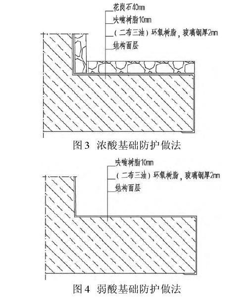 技術措施 1.1 設置酸霧處理系統(tǒng) 首先,在酸洗機組設置二級酸霧處理系統(tǒng),節(jié)能環(huán)保,凈化效果好。在酸洗過程中,酸洗槽、酸循環(huán)罐、漂洗槽內產生大量的鹽酸酸霧,由于酸洗槽、酸循環(huán)罐產生的酸霧含酸濃度高而漂洗槽產生的酸霧含酸濃度低,為了避免將洗滌塔規(guī)模做的很大,所以高濃度的酸霧預先經過預處理裝置進行第一級凈化,將酸霧含酸濃度降低,然后再和漂洗槽產生的低濃度酸霧匯合進入酸霧洗滌塔中進行第二級凈化,這樣設計的好處在于可以使酸霧處理系統(tǒng)整體投資顯著降低,并且預處理產生的含酸濃度較高的酸液可以返回酸循環(huán)罐中繼續(xù)使用,節(jié)省酸液。酸霧洗滌塔噴淋用水采用機組漂洗槽的漂洗水,如果酸霧洗滌塔中水的電導率高于設定值,就通過補充脫鹽水來降低電導率,保證酸霧的清洗效果。洗滌塔中間采用填料層來增加酸霧的吸收面積,而且酸霧洗滌塔本身也采用兩級噴淋來清洗酸霧,經過噴淋凈化后的酸霧通過酸霧風機經煙囪排到大氣中。凈化后氣體含酸濃度≤ 20 mg/Nm3,遠優(yōu)于GB 16297-1996 大氣污染物綜合排放標準。酸霧處理流程圖如圖1。 1.2 設置廠房通風器 理想情況下,酸洗槽內部保持微負壓,所有酸霧均由酸霧處理系統(tǒng)處理后排放到大氣中。但是在長期的使用中,由于槽蓋變形,槽蓋、擠干輥等處的橡膠密封墊老化,抽風系統(tǒng)管道損壞等原因,酸洗槽內部不能時刻保持負壓造成酸霧輕微外泄。為避免外泄的酸霧腐蝕廠房和機電設備,在酸洗槽的上方車間屋脊處設置縱向電動開啟橢圓形成品自然通風器,將酸霧排出車間,見圖2。另外,在酸槽檢修維護時,槽蓋打開后也會有大量酸霧溢出,這時也可通過開啟通風器將酸霧排出車間,防止腐蝕現(xiàn)象的發(fā)生。 1.3 考慮廠房防護 廠房防護主要有:1)廠房鋼結構防護;2)廠房墻皮、屋面防護;3)設備基礎防護三種。 第一種,廠房鋼結構防護。目前新建的酸洗車間主要為鋼結構型式,由于車間內有酸霧逸出,使空氣中含有少量的腐蝕氣體的分子和離子。金屬表面相對濕度大,當溫度降低時廠房鋼結構表面結露形成潮濕水膜,水膜吸收酸性雜質形成一個個微電池,在電化學作用下加速了鋼結構的腐蝕。在氣相腐蝕條件下鋼結構防腐蝕常采用涂漆處理的方法。做法如下:鋼結構表面噴砂除銹后,涂環(huán)氧富鋅底漆1層50ìm,環(huán)氧云鐵中間漆2層130 ìm,環(huán)氧面漆2層50 ìm。一共涂覆5層,涂層總厚度230ìm ,基本做到密實無孔,阻止水汽及酸霧的滲透,起到較好的防腐作用。 第二種,廠房墻皮、屋面防護。廠房墻面、屋面均采用防酸彩色涂層壓型鋼板,基板使用耐腐蝕性能好的高強度熱鍍鋅鋼板,雙面鋅層重量不小于275 g/m2,因彩涂板本身就有良好的防腐性能無需再做特殊處理。 第三種,混凝土設備基礎防護。因酸洗車間相對濕度較大,所以車間內混凝土的碳化收縮比較大,酸霧和二氧化碳滲入混凝土的微孔中,很容易使混凝土表面pH值下降,生成碳酸鈣,當混凝土空隙中的pH值下降至9時,其表面即被碳化,又因為混凝土是多孔體,酸霧及二氧化碳可沿著空隙向里侵入,碳化層逐漸向里擴展,當擴展到鋼筋表面時鋼筋表面的鈍化膜被破壞,鋼筋開始銹蝕。 混凝土中的鋼筋由于碳化破壞引起兩種現(xiàn)象:一是先裂后腐蝕,即混凝土板面的微孔吸附了空氣中的水分子及酸霧等,引起混凝土結晶腐蝕而開裂,從而使鋼筋銹蝕;二是先腐蝕后開裂,最初混凝土表面看不出腐蝕痕跡,混凝土被碳化時,其內部鋼筋由于鈍化膜被破壞,鋼筋先銹蝕,層層疏松膨脹的鐵銹使混凝土脹裂。 針對混凝土基礎的腐蝕機理,對于積酸腐蝕,鋼筋混凝土設備基礎采用兩種防腐措施:對酸槽下方、酸循環(huán)區(qū)、酸溝、集水坑等可能接觸到高濃度酸液的區(qū)域采用結構面層+二布三油環(huán)氧樹脂玻璃鋼隔離層 + 呋喃樹脂+ 花崗巖(見圖3)。對普通介質溝、基礎側壁、酸泵基礎等接觸低濃度酸液的區(qū)域采用結構面層+二布三油環(huán)氧樹脂玻璃鋼隔離層+呋喃樹脂(見圖4),這兩種防腐措施組合使用既保證了防腐的效果又經濟合理避免浪費。 2 結論 酸洗車間的腐蝕防護問題是一個綜合工程,由于酸洗工藝的特殊性,無法從根本上避免鹽酸腐蝕的問題,但通過在酸洗機組設置酸霧處理系統(tǒng),在廠房增設天窗通風,考慮廠房鋼結構以及設備基礎的防腐設計,可以使腐蝕現(xiàn)象降低到可控的范圍。
