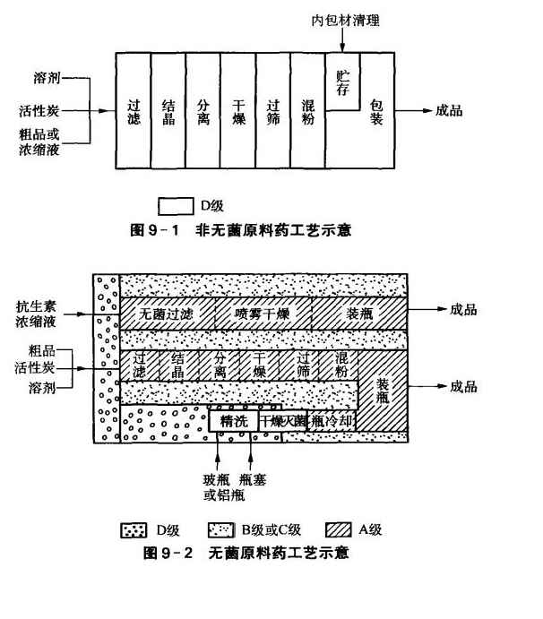 原料藥一般由化學(xué)合成、DNA重組技術(shù)、發(fā)酵、酶反應(yīng)或從天然物質(zhì)提取制得,它是加工藥物制劑的主要原料, 原料藥分無(wú)菌原料藥和非無(wú)菌原料藥。前者是要按規(guī)定進(jìn)行法定的無(wú)菌檢查,后者則不需要作此檢查。 GMP(2010)對(duì)非無(wú)菌原料藥的精、烘、包操作工序的暴露環(huán)境推薦采用無(wú)菌藥品的D級(jí)區(qū)標(biāo)準(zhǔn)。 所謂“精”,即精制,包括精濾、結(jié)晶、分離、檢驗(yàn)等工序。 所謂“烘“,即干燥,包括干燥、粉碎、混粉及檢驗(yàn)等工序。 所謂“包”,即包裝,包括包裝材料的處理和包裝等工序。 原料藥精、烘、包各工序的特點(diǎn)是: (1)精濾對(duì)法定要無(wú)菌檢查的,對(duì)無(wú)菌藥品確定環(huán)境級(jí)別;不需無(wú)菌檢查的,則只要求D級(jí)環(huán)境。 (2)結(jié)晶要求與精濾相同。 (3)分離注意分離有機(jī)溶媲或有氣妹的品種時(shí),應(yīng)采取措施,防止溶媒或氣味在室內(nèi)擴(kuò)散。 (4)干燥(俗稱烘干)盡可能采用干燥、混粉一次完成的設(shè)備;干燥時(shí)所用的空氣應(yīng)經(jīng)凈化處理,達(dá)到與生產(chǎn)環(huán)境同等潔凈程度;尾氣需經(jīng)捕集、除塵后再排放。 (5)粉碎和過(guò)篩應(yīng)有局部防塵或吸塵裝置。 (6)檢驗(yàn)。 (7)包裝材料處理注意直接接觸藥品的包裝材料應(yīng)按適當(dāng)方法清潔消毒,其中無(wú)菌原料藥所用的內(nèi)包材要用經(jīng)過(guò)過(guò)濾的注射用水沖洗,并在4h內(nèi)滅菌,24h內(nèi)使用,且均應(yīng)專柜貯存在與包裝同等潔凈度級(jí)別的貯存室內(nèi)。 (8)包裝有換批生產(chǎn)時(shí),注意做好清場(chǎng)工作。 圖9-1是非無(wú)菌原料藥工藝示意圖。 圖9-2是無(wú)菌原料藥工藝示意圖。 (9)廠房設(shè)計(jì)GMP規(guī)定原料藥的質(zhì)量標(biāo)準(zhǔn)中有熱原或細(xì)菌內(nèi)毒素等檢驗(yàn)項(xiàng)目的,廠房的設(shè)計(jì)應(yīng)特別注意防止微生物污染,如應(yīng)根據(jù)工藝要求設(shè)定相應(yīng)廠房的潔凈度級(jí)別。 質(zhì)檢實(shí)驗(yàn)室通常應(yīng)與生產(chǎn)區(qū)分開(kāi)。當(dāng)生產(chǎn)操作和檢驗(yàn)結(jié)果之間無(wú)互相不利影響時(shí),中間控制實(shí)驗(yàn)室可設(shè)在生產(chǎn)區(qū)內(nèi)。 GMP(2010)的術(shù)語(yǔ)定義指出中間控制“也稱過(guò)程控制,指為確保產(chǎn)品符合有關(guān)標(biāo)準(zhǔn),生產(chǎn)中對(duì)工藝過(guò)程加以監(jiān)控,以便在必要時(shí)進(jìn)行調(diào)節(jié)而做的各項(xiàng)檢查。”當(dāng)然,中間控制操作不得給藥品帶來(lái)質(zhì)量風(fēng)險(xiǎn)。 (10)設(shè)備可用同一設(shè)備生產(chǎn),但應(yīng)有防止交叉污染的措施,應(yīng)有適當(dāng)間隔。難以清潔的設(shè)備或部件應(yīng)專用。在無(wú)菌操作條件下添加細(xì)胞基質(zhì)、培養(yǎng)基、緩沖液和氣體,應(yīng)當(dāng)采用密閉或封閉系統(tǒng)。 (11)清洗更換批次或品種生產(chǎn)前,必須對(duì)設(shè)備徹底清洗。 (12)發(fā)酵工藝采用發(fā)酵工藝生產(chǎn)原料藥應(yīng)根據(jù)生產(chǎn)步驟和生產(chǎn)條件(敞口、密閉或封閉系統(tǒng))確定環(huán)境控制標(biāo)準(zhǔn)。初始容器接種、轉(zhuǎn)種或加料(培養(yǎng)基、緩沖液)使用敞口容器操作時(shí),如微生物污染可能危及原料藥質(zhì)量時(shí),敞口容器應(yīng)置于適當(dāng)?shù)目刂骗h(huán)境中。 需在無(wú)菌操作條件下添加細(xì)胞基質(zhì)、培養(yǎng)基、緩沖液和氣體時(shí),應(yīng)采用密閉或封閉系統(tǒng)。 (13)容器對(duì)可重復(fù)使用的容器應(yīng)行清潔并去除或涂毀其原有標(biāo)簽。