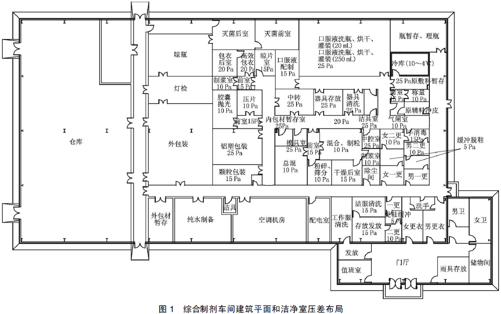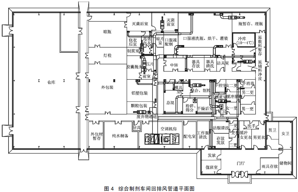 摘要 介紹了該車間的凈化空調(diào)系統(tǒng)設(shè)計(jì), 分析了凈化空調(diào)系統(tǒng)的設(shè)計(jì)方法, 總結(jié)了設(shè)計(jì)中的計(jì)算方法和其中一些經(jīng)驗(yàn)數(shù)據(jù)的選取, 結(jié)合實(shí)例分析了系統(tǒng)風(fēng)管管路布置方法。 關(guān)鍵詞 凈化空調(diào) 空調(diào)系統(tǒng)設(shè)計(jì) 潔凈度 計(jì)算方法 0 引言 隨著科學(xué)技術(shù)的發(fā)展和醫(yī)療水平的提高, 來自藥品的不良反應(yīng)問題日益引起人們的關(guān)注, 因此人們對(duì)藥品生產(chǎn)環(huán)境的要求也越來越高。為防止藥品在生產(chǎn)過程中因塵埃微粒和微生物而引起污染,在設(shè)計(jì)藥廠潔凈廠房的空調(diào)系統(tǒng)時(shí), 應(yīng)嚴(yán)格遵守國家頒布的《藥品生產(chǎn)質(zhì)量管理規(guī)范》(簡(jiǎn)稱GMP)、《潔凈廠房設(shè)計(jì)規(guī)范》[ 1] 和《醫(yī)藥工業(yè)潔凈廠房設(shè)計(jì)規(guī)范》[ 2] 。 通過凈化空調(diào)可以控制潔凈車間內(nèi)的潔凈度、溫度、濕度、室內(nèi)壓力和氣流組織在要求的范圍內(nèi), 因此藥廠的凈化空調(diào)是保證藥品生產(chǎn)環(huán)境的重要措施。 制藥廠綜合制劑車間的凈化空調(diào)系統(tǒng)設(shè)計(jì), 總結(jié)凈化空調(diào)系統(tǒng)的設(shè)計(jì)方法, 并對(duì)設(shè)計(jì)中的計(jì)算數(shù)據(jù)進(jìn)行總結(jié)和分析, 探討冷熱負(fù)荷計(jì)算、風(fēng)量計(jì)算及房間正壓的設(shè)定。 1 工程概況 該綜合制劑車間總建筑面積2 519 m2, 潔凈區(qū)域面積686 m2 , 建筑高度6 .7 m 。凈化空調(diào)系統(tǒng)采用集中式單風(fēng)機(jī)系統(tǒng), 該車間潔凈度等級(jí)為100 000 級(jí)。 2 主要設(shè)計(jì)參數(shù) 2.1 空調(diào)室外設(shè)計(jì)參數(shù)(見表1) 2.2 室內(nèi)設(shè)計(jì)參數(shù) 室內(nèi)設(shè)計(jì)參數(shù)根據(jù)《醫(yī)藥工業(yè)潔凈廠房設(shè)計(jì)規(guī)范》[ 2] 和生產(chǎn)工藝要求來確定。 綜合制劑車間100 000 級(jí)凈化區(qū)域設(shè)計(jì)溫度:夏季22 ~ 26 ℃, 冬季18 ~ 22 ℃;相對(duì)濕度:夏季45 %~ 65 %, 冬季45 %~ 65 %。 3 綜合制劑車間平面布局 潔凈廠房的設(shè)計(jì)原則是控制污染源對(duì)藥品的污染, 切實(shí)找到多種污染物(如人員、機(jī)器及其他生產(chǎn)設(shè)備、原材料與經(jīng)過加工的原材料等等)的傳播途徑和規(guī)律, 分清主次, 采取相應(yīng)的措施去限制污染物的傳播, 重要地方盡量減少人流、物流污染。結(jié)合綜合制劑的生產(chǎn)工藝流程, 該車間建筑平面布局如圖1 所示。 4 凈化空調(diào)系統(tǒng)設(shè)計(jì) 合理的凈化空調(diào)系統(tǒng)是使整個(gè)潔凈車間處于受控狀態(tài)的重要保障。潔凈車間不但要求凈化空調(diào)系統(tǒng)能夠控制車間內(nèi)的溫度、濕度、潔凈度,提供室內(nèi)人員所需新風(fēng)量, 維持室內(nèi)合理的氣流流向和各房間合理、有序的壓力梯度;同時(shí)還要能及時(shí)排出房間內(nèi)散發(fā)的有毒、有害、易燃易爆氣體, 并且根據(jù)排出氣體的不同性質(zhì), 在排風(fēng)系統(tǒng)中設(shè)置排風(fēng)過濾裝置或排風(fēng)凈化處理裝置, 消除排風(fēng)對(duì)室外大氣環(huán)境的污染。 該車間凈化空調(diào)系統(tǒng)采用一次回風(fēng)系統(tǒng), 空氣處理流程如圖2 所示。 4.1 凈化空調(diào)系統(tǒng)設(shè)計(jì)計(jì)算步驟 凈化空調(diào)系統(tǒng)的設(shè)計(jì)計(jì)算是整個(gè)設(shè)計(jì)中極其重要的一個(gè)環(huán)節(jié), 設(shè)計(jì)計(jì)算一般步驟如下[ 3] : 1)根據(jù)工藝要求確定潔凈室的潔凈度等級(jí),選擇氣流流型, 并決定采用全室空氣凈化還是局部空氣凈化。 2)計(jì)算潔凈室的冷熱負(fù)荷。 3)計(jì)算新風(fēng)量。 4)計(jì)算送風(fēng)量(計(jì)算保證空氣潔凈度等級(jí)需要的送風(fēng)量, 并計(jì)算消除室內(nèi)熱濕負(fù)荷需要的送風(fēng)量以及滿足新風(fēng)量需求的送風(fēng)量進(jìn)行校核, 按最大風(fēng)量進(jìn)行調(diào)整)。 5)根據(jù)送風(fēng)量、冷熱負(fù)荷和選擇的氣流組織形式, 計(jì)算氣流組織各相關(guān)參數(shù)。 6)確定空氣加熱、冷卻、加濕、除濕等處理方案。 7)根據(jù)工藝要求計(jì)算空調(diào)機(jī)組處理風(fēng)量及潔凈室循環(huán)風(fēng)量。 8)計(jì)算總的冷熱負(fù)荷, 選擇空氣處理設(shè)備。 4.2 潔凈室負(fù)荷計(jì)算 通常情況下, 潔凈室處于建筑內(nèi)區(qū), 圍護(hù)結(jié)構(gòu)引起的冷負(fù)荷Q 可按式(1)計(jì)算[ 4] : Q =KF(twp +Δt ls -t n) (1) 式中 K 為內(nèi)圍護(hù)結(jié)構(gòu)(如內(nèi)墻、樓板等)的傳熱系數(shù),W/(m2 · ℃);F 為內(nèi)圍護(hù)結(jié)構(gòu)的面積, m2 ; twp為夏季空調(diào)室外計(jì)算日平均溫度, ℃;Δtls 為鄰室溫升, ℃, 可按表2 選取;t n 為室內(nèi)計(jì)算溫度, ℃。 經(jīng)計(jì)算, 該工程總冷負(fù)荷為283 kW , 總熱負(fù)荷為265 kW , 總加濕量為125 kg/h 。 4.3 潔凈室新風(fēng)量、送風(fēng)量、回風(fēng)量計(jì)算 凈化空調(diào)系統(tǒng)的風(fēng)量計(jì)算是設(shè)計(jì)計(jì)算中最重要的環(huán)節(jié)之一, 由于產(chǎn)塵量很難進(jìn)行準(zhǔn)確計(jì)算, 且室內(nèi)微粒的分布不均勻, 因此潔凈室工程實(shí)際設(shè)計(jì
